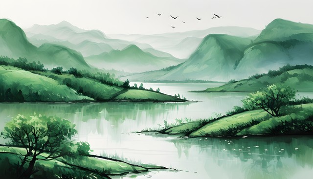 翠绿山水画,湖泊与远山相映成趣,展现自然的和谐美。