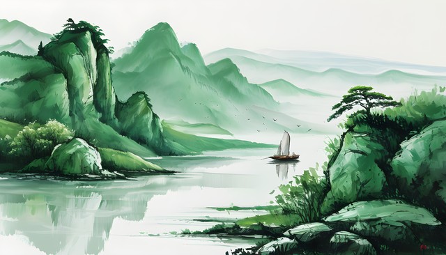 翠绿山水画,湖泊与远山相映成趣,展现自然的和谐美。