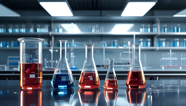 实验室内各种试剂瓶,装有不同颜色的液体,透出科学氛围。