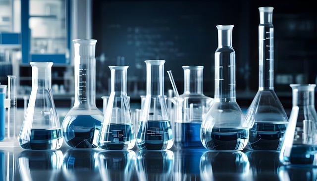 实验室内各种试剂瓶,装有不同颜色的液体,透出科学氛围。