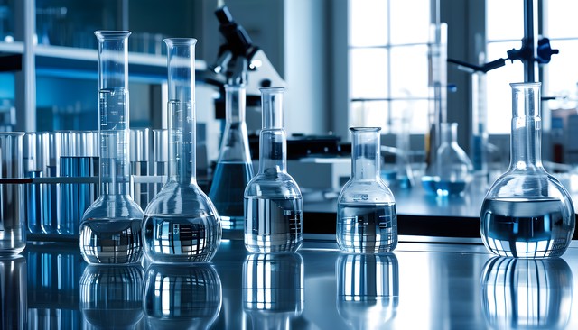 实验室内各种试剂瓶,装有不同颜色的液体,透出科学氛围。