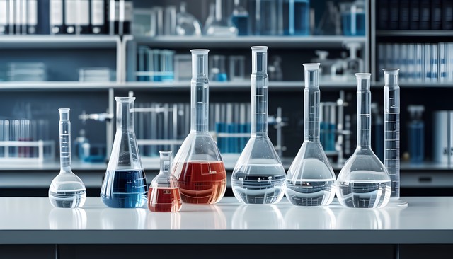 实验室内各种试剂瓶,装有不同颜色的液体,透出科学氛围。