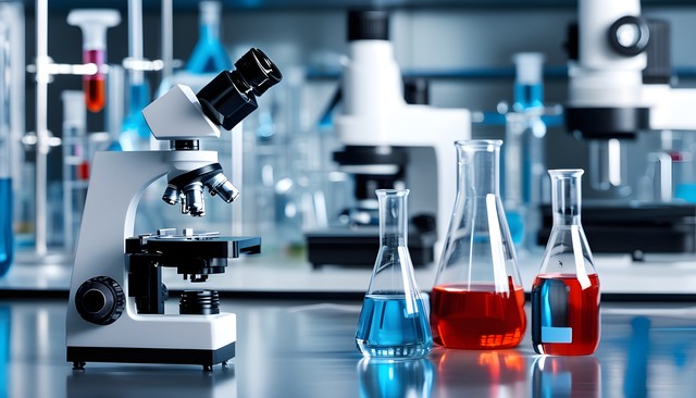 实验室中的显微镜和试管,色彩丰富,科学气息浓厚。