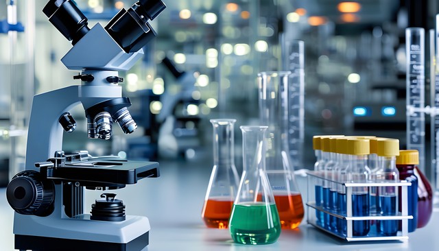 实验室中的显微镜和试管,色彩丰富,科学气息浓厚。