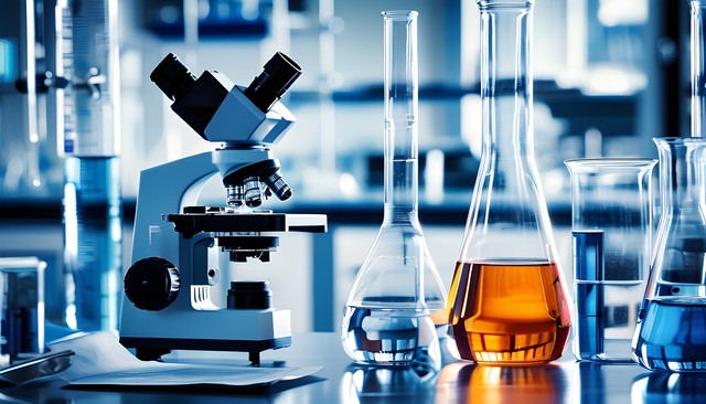 实验室中的显微镜和试管,色彩丰富,科学气息浓厚。
