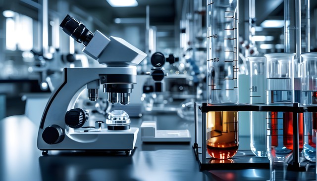 实验室中的显微镜和试管,色彩丰富,科学气息浓厚。