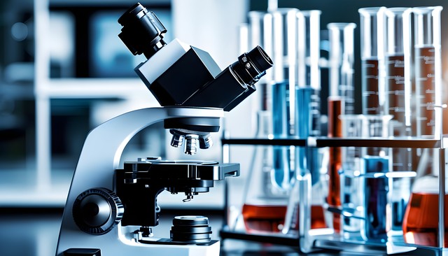 实验室中的显微镜和试管,色彩丰富,科学气息浓厚。