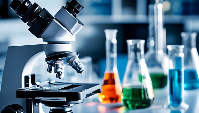 实验室中的显微镜和试管,色彩丰富,科学气息浓厚。
