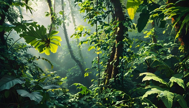 郁郁葱葱的雨林,阳光透过树叶洒下,充满生机。
