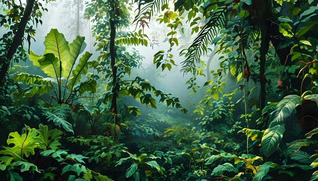 郁郁葱葱的雨林,阳光透过树叶洒下,充满生机。