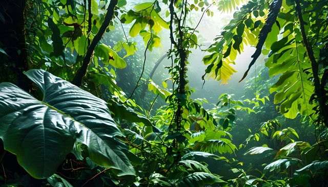 郁郁葱葱的雨林,阳光透过树叶洒下,充满生机。