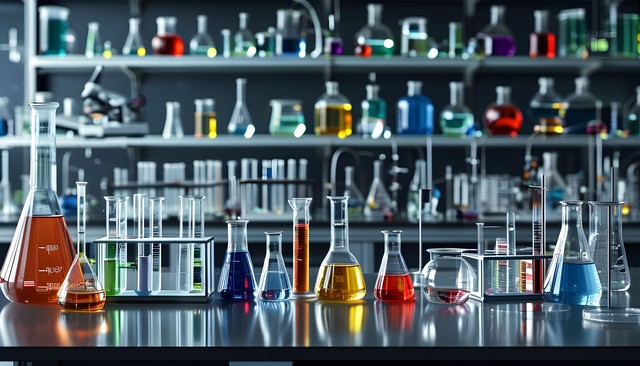 实验室中各式各样的试剂瓶和显微镜,展现科学研究的氛围。