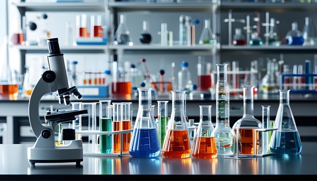 实验室中各式各样的试剂瓶和显微镜,展现科学研究的氛围。