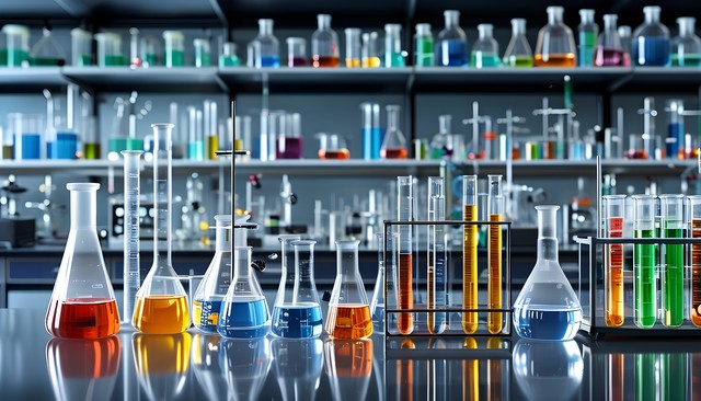 实验室中各式各样的试剂瓶和显微镜,展现科学研究的氛围。