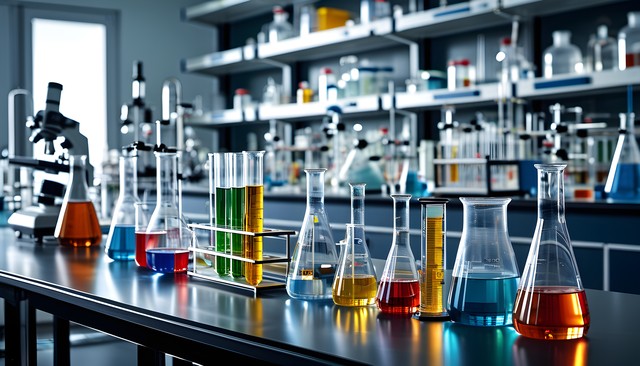 实验室中各式各样的试剂瓶和显微镜,展现科学研究的氛围。