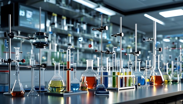 实验室中各式各样的试剂瓶和显微镜,展现科学研究的氛围。