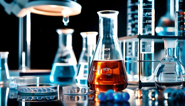 色彩斑斓的实验室玻璃器具与液体,科学探索的象征。