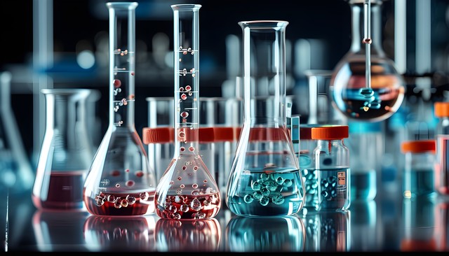 色彩斑斓的实验室玻璃器具与液体,科学探索的象征。