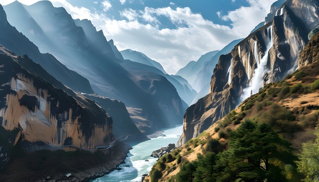 壮丽的山谷与蜿蜒的河流交相辉映,展现出大自然的壮观景象。
