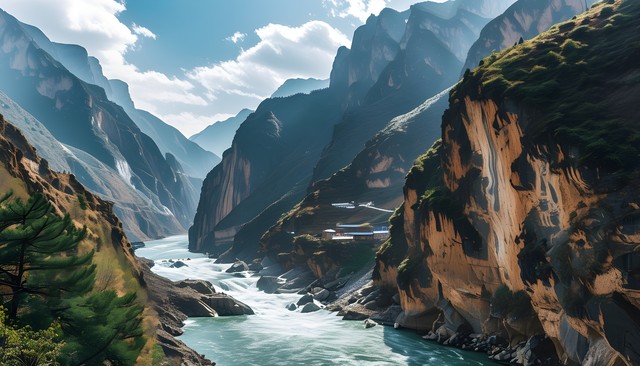 壮丽的山谷与蜿蜒的河流交相辉映,展现出大自然的壮观景象。