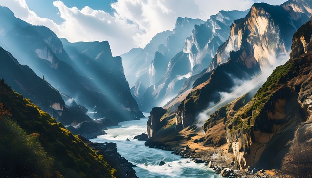壮丽的山谷与蜿蜒的河流交相辉映,展现出大自然的壮观景象。