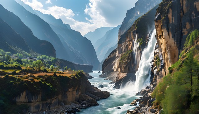 壮丽的山谷与蜿蜒的河流交相辉映,展现出大自然的壮观景象。