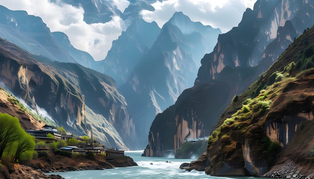 壮丽的山谷与蜿蜒的河流交相辉映,展现出大自然的壮观景象。