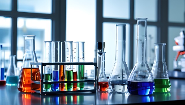 实验室内各种显色试剂反应的试管和烧杯,科学研究的氛围。