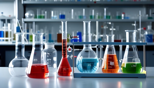 实验室内各种显色试剂反应的试管和烧杯,科学研究的氛围。