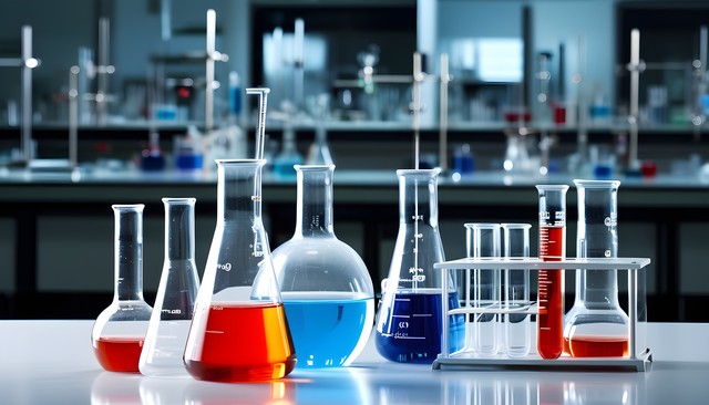 实验室内各种显色试剂反应的试管和烧杯,科学研究的氛围。