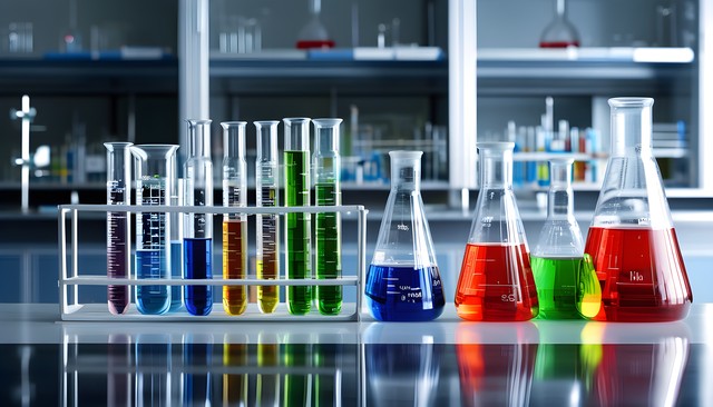 实验室内各种显色试剂反应的试管和烧杯,科学研究的氛围。