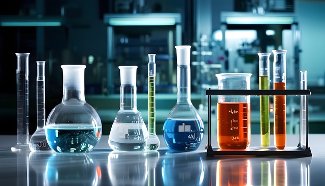 实验室内各种显色试剂反应的试管和烧杯,科学研究的氛围。