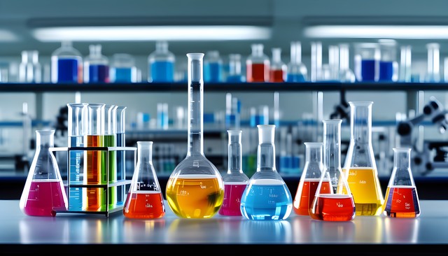 实验室内各种显色试剂反应的试管和烧杯,科学研究的氛围。
