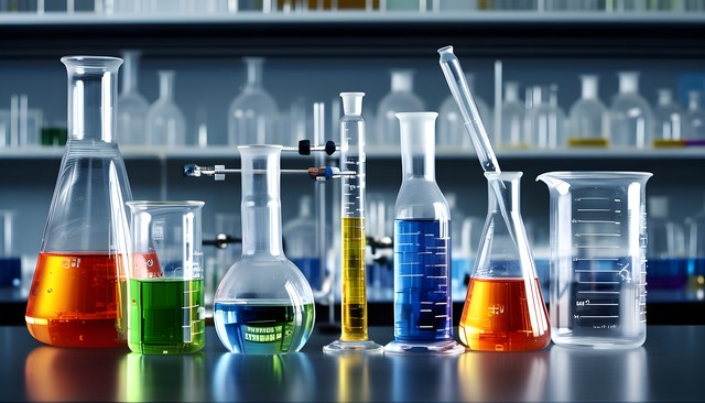 实验室内各种显色试剂反应的试管和烧杯,科学研究的氛围。