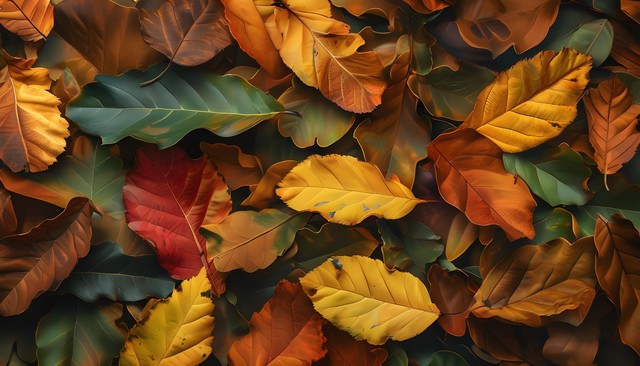 五彩斑斓的秋天落叶铺满地面,呈现出温暖的色彩与自然之美。