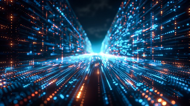 抽象发光的蓝色数字化科技,未来主义城市灯光和空中流动的数据,数字技术概念科学大数据运用数据流和信息流