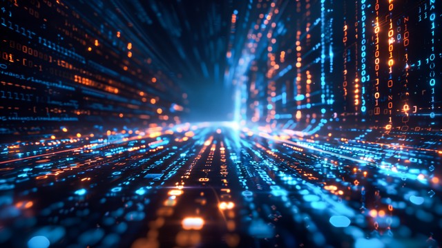 抽象发光的蓝色数字化科技,未来主义城市灯光和空中流动的数据,数字技术概念科学大数据运用数据流和信息流
