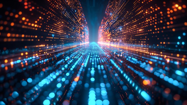 抽象发光的蓝色数字化科技,未来主义城市灯光和空中流动的数据,数字技术概念科学大数据运用数据流和信息流