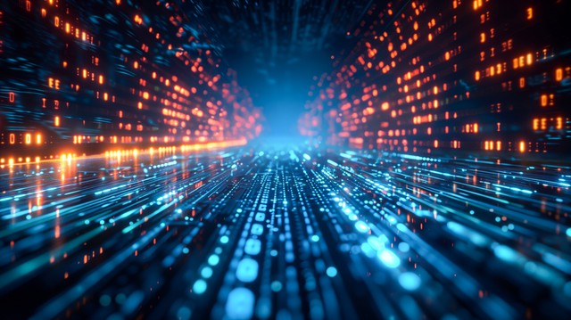抽象发光的蓝色数字化科技,未来主义城市灯光和空中流动的数据,数字技术概念科学大数据运用数据流和信息流