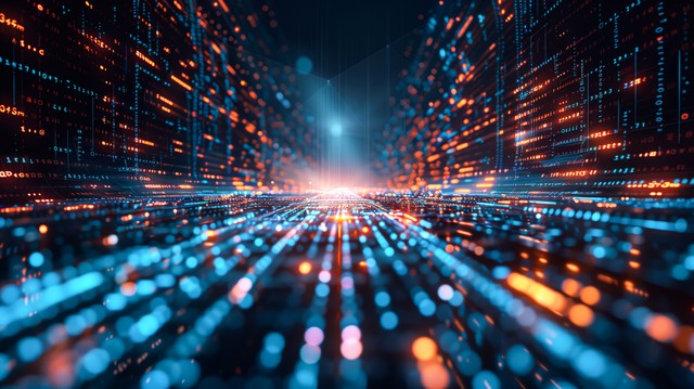 抽象发光的蓝色数字化科技,未来主义城市灯光和空中流动的数据,数字技术概念科学大数据运用数据流和信息流