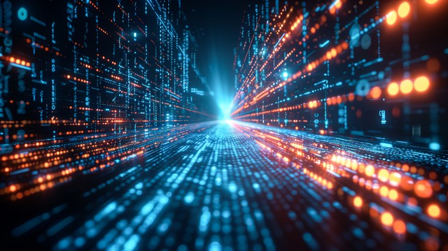 抽象发光的蓝色数字化科技,未来主义城市灯光和空中流动的数据,数字技术概念科学大数据运用数据流和信息流
