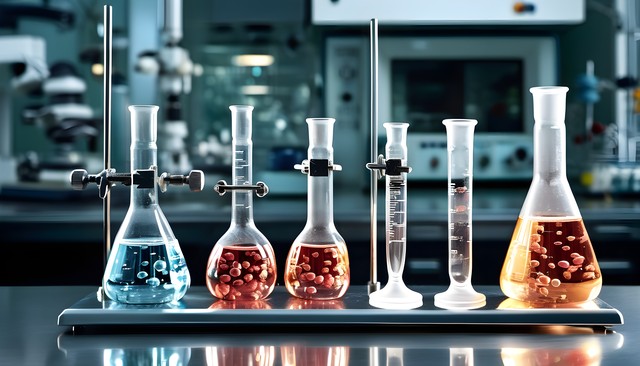 实验室中排列整齐的试管,各种液体颜色各异,周围器械整齐放置。