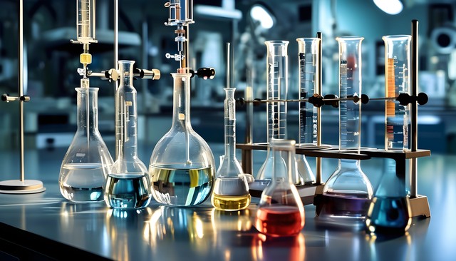 实验室中排列整齐的试管,各种液体颜色各异,周围器械整齐放置。