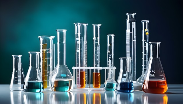 实验室中排列整齐的试管,各种液体颜色各异,周围器械整齐放置。