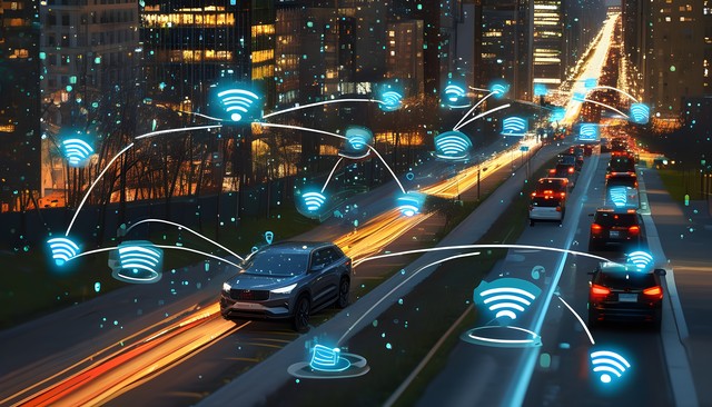 现代智能汽车在城市背景下,展示网络连接和技术元素。