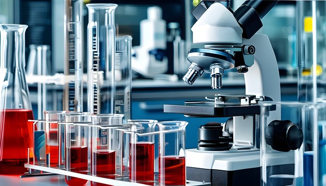 实验室桌面上的显微镜和多种颜色的液体瓶,科技感十足。