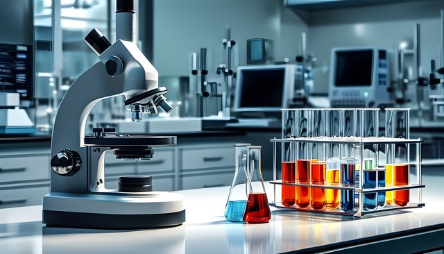 实验室桌面上的显微镜和多种颜色的液体瓶,科技感十足。
