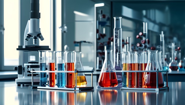 实验室桌面上的显微镜和多种颜色的液体瓶,科技感十足。
