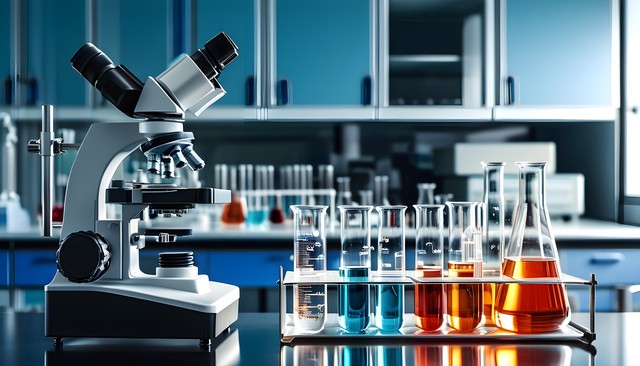 实验室桌面上的显微镜和多种颜色的液体瓶,科技感十足。