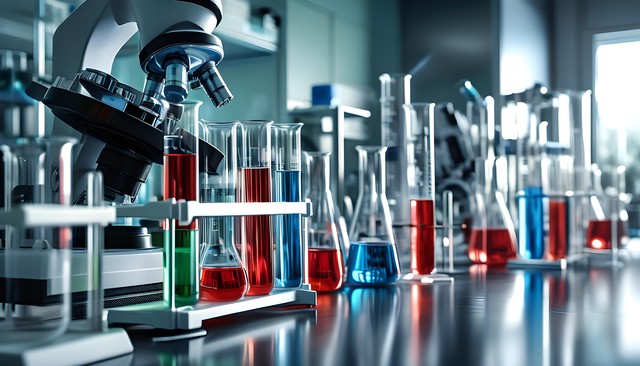 实验室桌面上的显微镜和多种颜色的液体瓶,科技感十足。